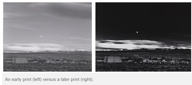 See https://petapixel.com/2018/11/07/the-story-behind-ansel-adams-iconic-moonrise-hernandez/ for an article on Moonrise Over Hernandez, one of Ansel Adams’ most famous photos.